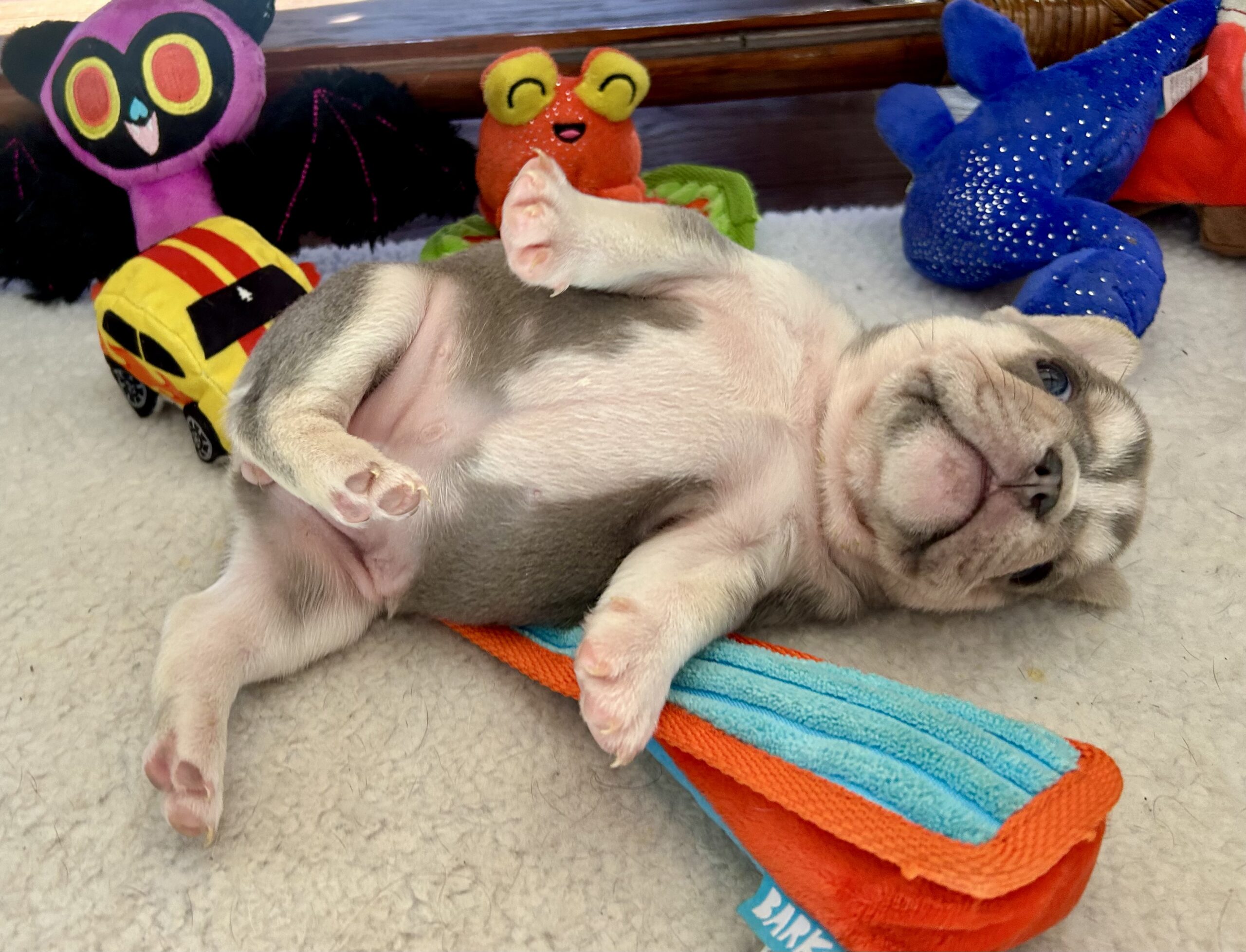 I love my toys, belly-up naps